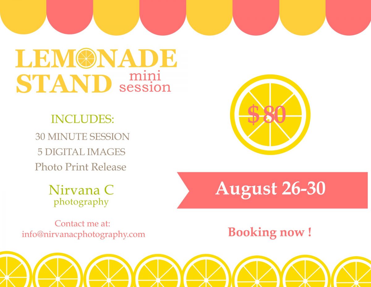 Lemonade stand mini sessions are my favorite because they are a fun and inexpensive way to update your children’s photos. The lemonade stand stylized photo-shoot sessions will have a vintage feel with a modern twist. The color combination of the lemonade stand and outdoor sunshine will be beautiful, adding more color and vivacity to the images.